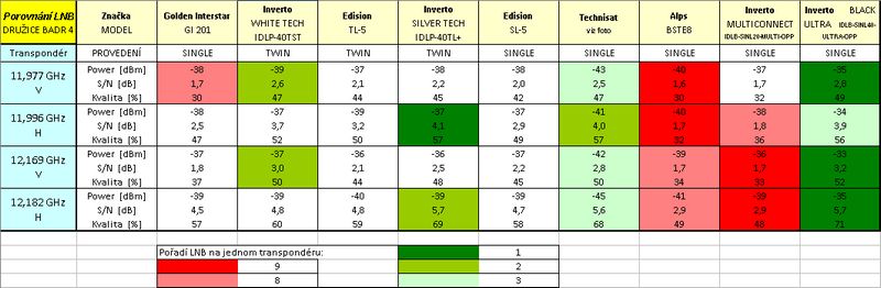 Z tabulky transpondérů je patrné, že všechny 4 testovací TP jsou zarušeny z obou sousedících satelitů ASTRA. Na prvních třech místech to bylo docela vyrovnané. Klasicky 60mm široká Inverta si obecně vedla velice době, jen SilverTech trochu zaostával na vertikálu. Perfektně rovněž fungoval Technisat 0,6 dB. Jako nevhodné se v daném případě ukázaly být konvertory s úzkým ozařovačem. WhiteTechy se od sebe lišily v toleranci 1%, to samé platilo o Ultras – jako přes kopírák. Během testu vládlo stabilní počasí. Po ukončení testu Ultras jsem znovu provedl kontrolu pomocí Golden Interstaru a naměřil jsem téměř totožné hodnoty.