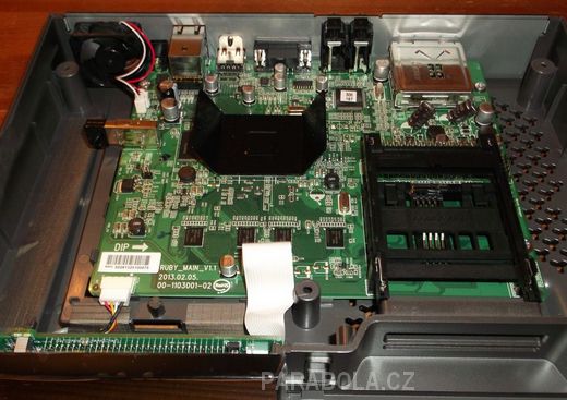 Opět mám od dodavatele dovoleno nahlédnout i do vnitřností přístroje, horní kryt se snadno odstraní po odšroubování pěti spodních šroubků. Pak už se před námi objeví jediná základní deska, kde je integrováno úplně všechno vybavení. Další malá část je deska s předním displejem, zapínacím tlačítkem a přijímačem infračerveného signálu dálkového ovladače. Uprostřed je vidět chladič procesoru, okolo něho flash a RAM paměti, vpravo kombinované konektory CAM a CI. V levé části upoutá zajímavé řešení Wi-Fi výbavy – klasický USB konektor, do kterého je vsunut běžný USB Wi-Fi dongle.