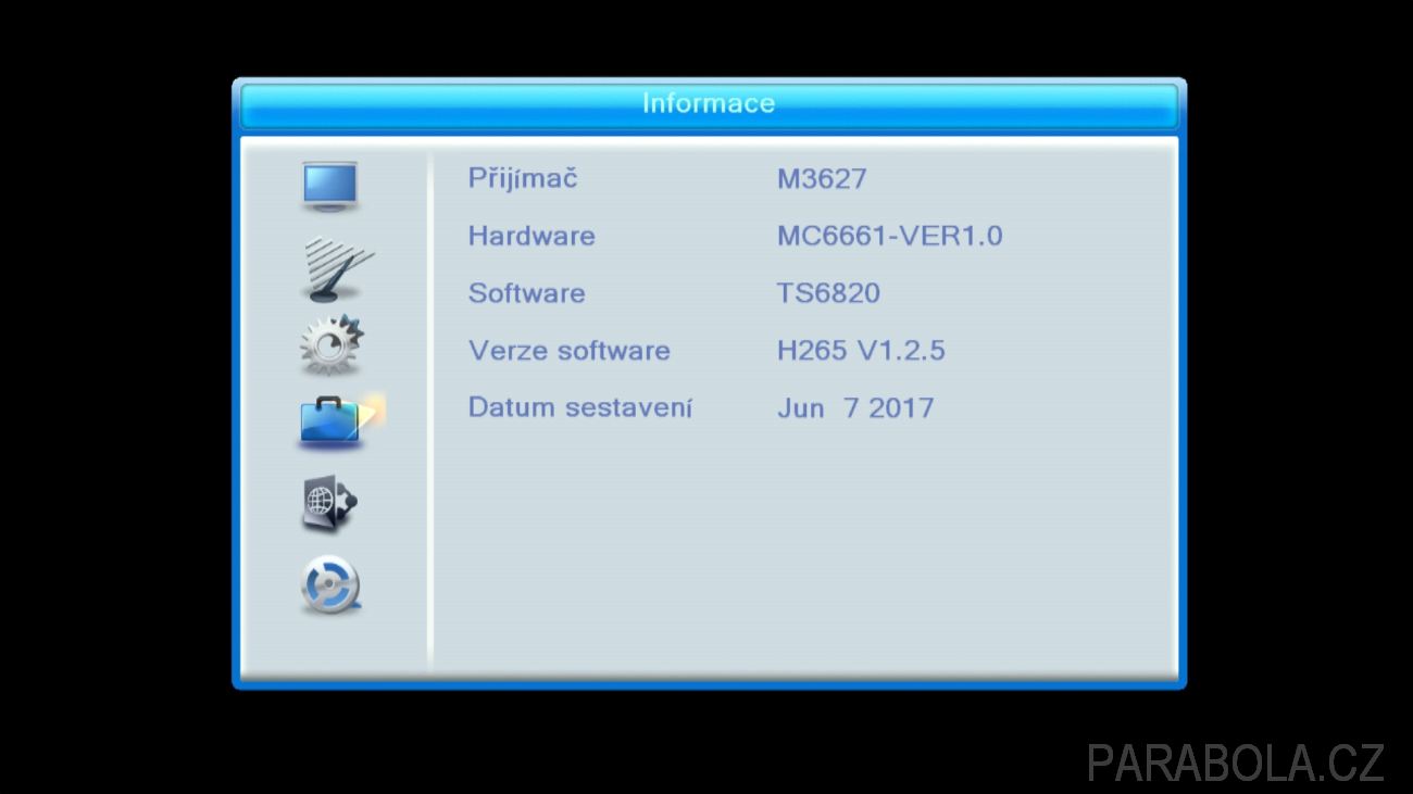 Dvoutunerový set top box byl dodaný se softwarem 1.2.5 ze 7.6.2017, jednotunerový set top box obsahoval software 1.0.7 ze 4.6.2017. Novější software nebyl na webu výrobce k dispozici.Oba set top boxy se chovaly při testování podobně, ale nějaké rozdíly jsem našel. Vzhled menu je u obou set top boxů různý, i když se jedná o výrobky jedné továrny. Důvodem je použití odlišných procesorů, u modelu TS6820 Twin je použit chip ALi, u TS UNICO je to chip Sun+.
