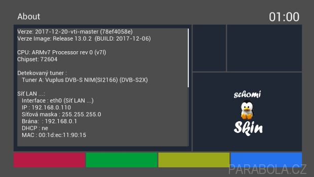 K dispozici je také oblíbený plugin Fastscan pro rychlé vyhledávání programů satelitního operátora Skylink, který je již v image VTI 13.0.2 nainstalován. Funkce DLNA server nebo DLNA prohlížeč je nutné doinstalovat přes pluginy.