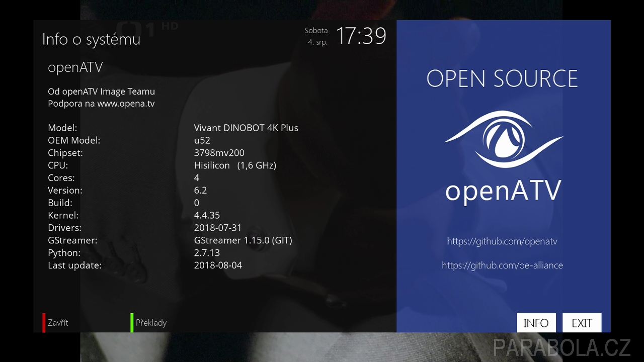 Pluginy jsou stejné jako pro ostatní image OpenATV. Co však nefungovalo v tomto konkrétním případě bylo Kodi (OpenATV 6.2 z 31.7.2018). Nezkoušel jsem starší image tam to třeba může fungovat. Kvalita obrazu excelentní, rozdíl oproti E2 ARM je viditelný a to nejen 4K, záleží především ale na kvalitě zdroje.