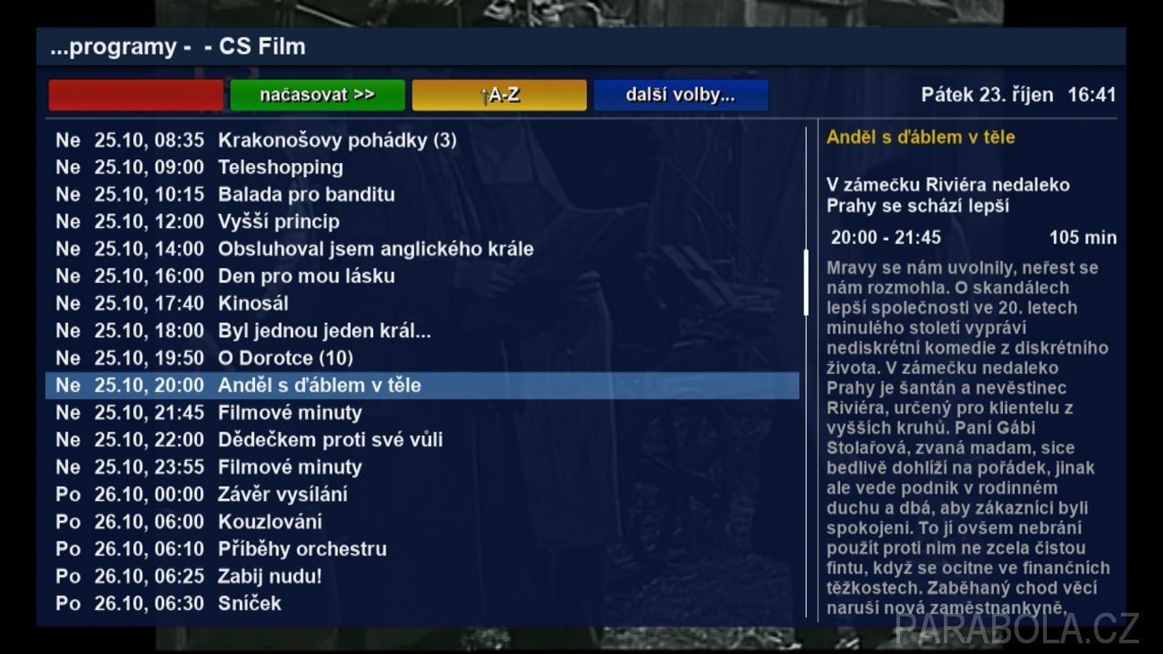 Přijímač umí zobrazit EPG na několik dní dopředu, pokud je provider vysílá. Načítání informací je bleskové, EPG data se ukládají automaticky do flash paměti přijímače.