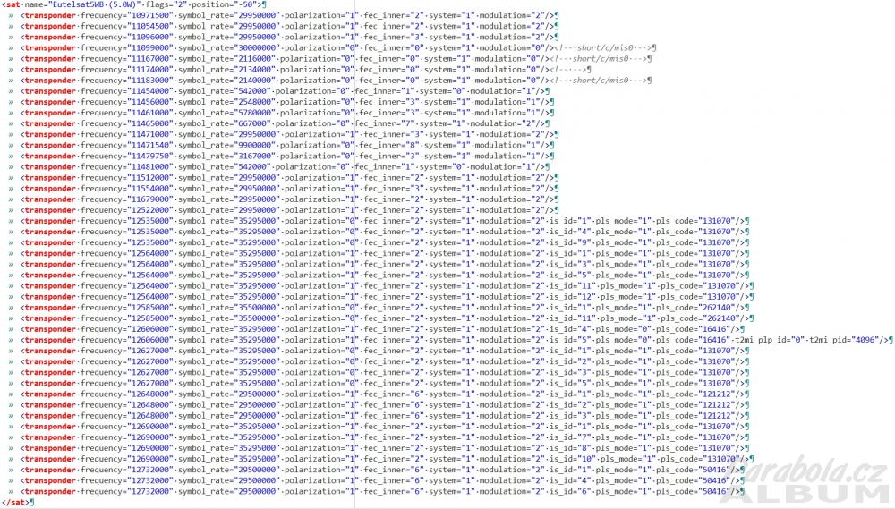 @A je toStaci pouzivat spravny satellites.xml a parametre nie je potrebne zadavathttps://www.parabola.cz/album/foto-1904/ https://www.parabola.cz/album/foto-1901/ https://www.parabola.cz/album/foto-1902/ https://www.parabola.cz/album/foto-1903/ Popis fotografií: [1] satellites.xml [2] Program Rai4K [3] Obsah transponderu s RAI4K [4] Transponder s RAI4K TBS5925 , Coolstream Zee2 , Dreambox 7020HD , WaveFrontier T90 , Gibertiny OP100 90E~50W