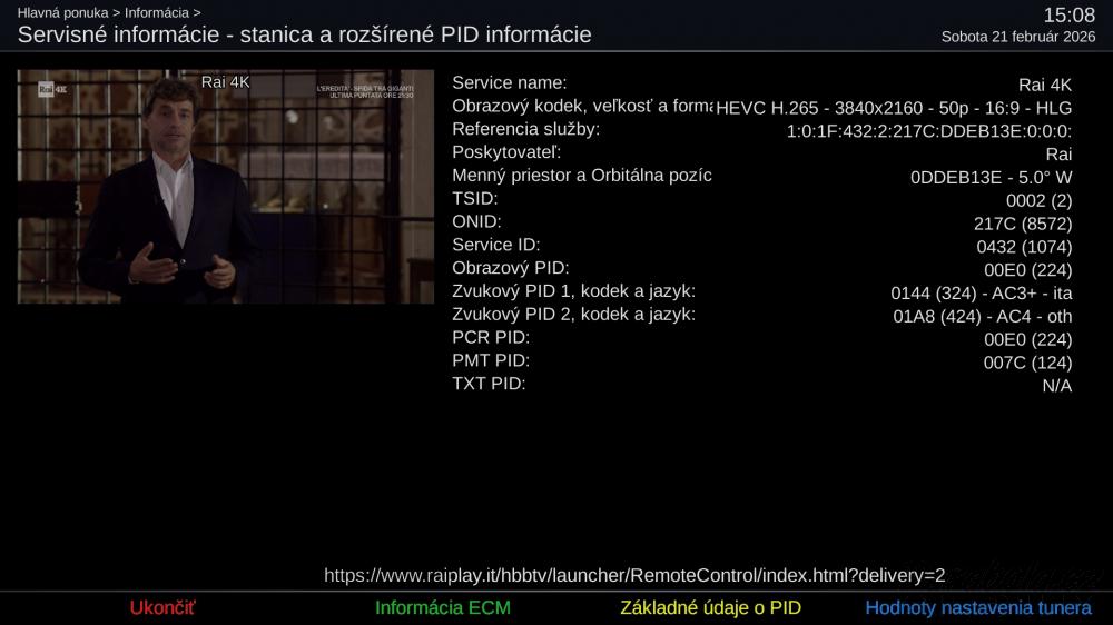 @fergiUverim az sem das screenshotlebo podla tychto parametrov paraboly.cz to nenaladim satelit: Eutelsat 5 West B (5°W) frekvence: 12,606 GHz polarizace: vertikální SR: 35300 FEC: 2/3 norma: DVB-S2 modulace: 8PSK mód: multistream / T2-MI Rai 4K. service ID: 1074 video PID: 224 (HEVC/4K) audio PIDy: 324 (EAC3, italsky), 424 (AC4, různý) CA systémy: žádný, FTA co je zle nastavene? https://prnt.sc/VZF0xb8809J4 |